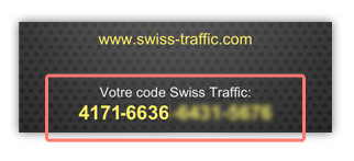Votre code Swiss-Traffic permet d'accèder à la section Membres, de gérer votre compte et d'acheter ou prolonger votre forfait.